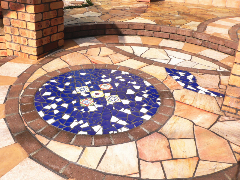 アプローチは、タイル・レンガ・乱石の色や敷きパターンにこだわり、鮮やかなブルーと玉竜のグリーンのラインを アクセントにして、落ち着いた雰囲気でありながらも個性的になるように工夫しました。