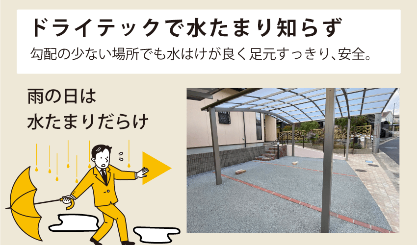 アプローチやカースペースなど、水たまりができる、水はけが悪く濡れてもなかなか乾かないなどの解決に、ドライテックがおすすめです。雨水を地中へ浸水させる透水性を備えた高性能土間コンクリートで、昨今増えているゲリラ豪雨などの対策にも一役買います。