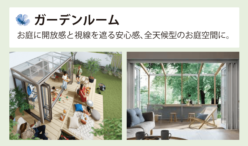夏は風通しの良いテラスとして、冬は外気から守られたガーデンルームとして快適なのき空間をお楽しみいただけます