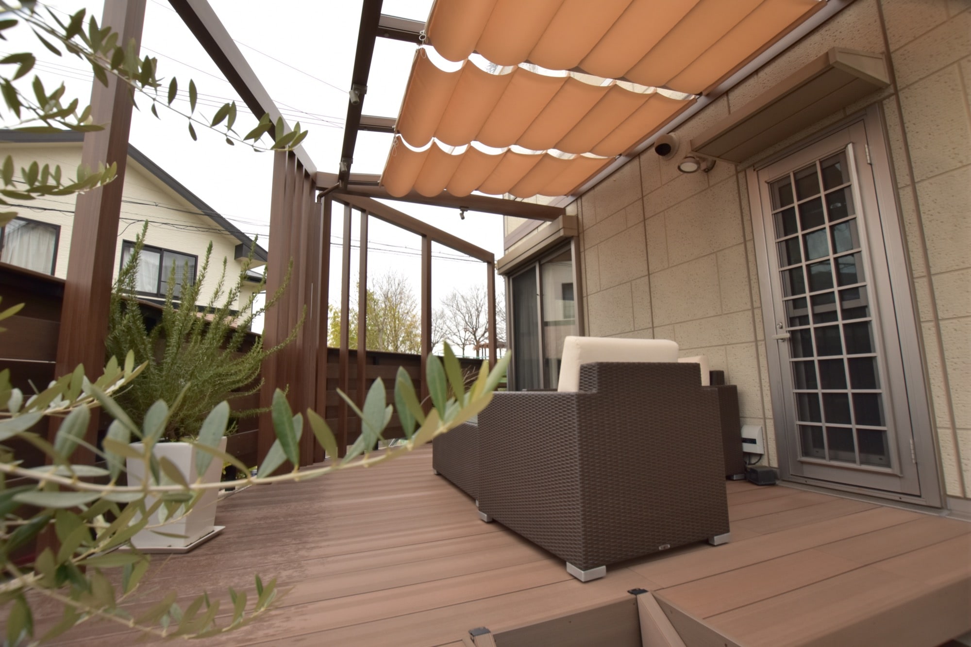明るい木調色のウッドデッキは、柔らかい印象で憩いの時間を演出できます。
