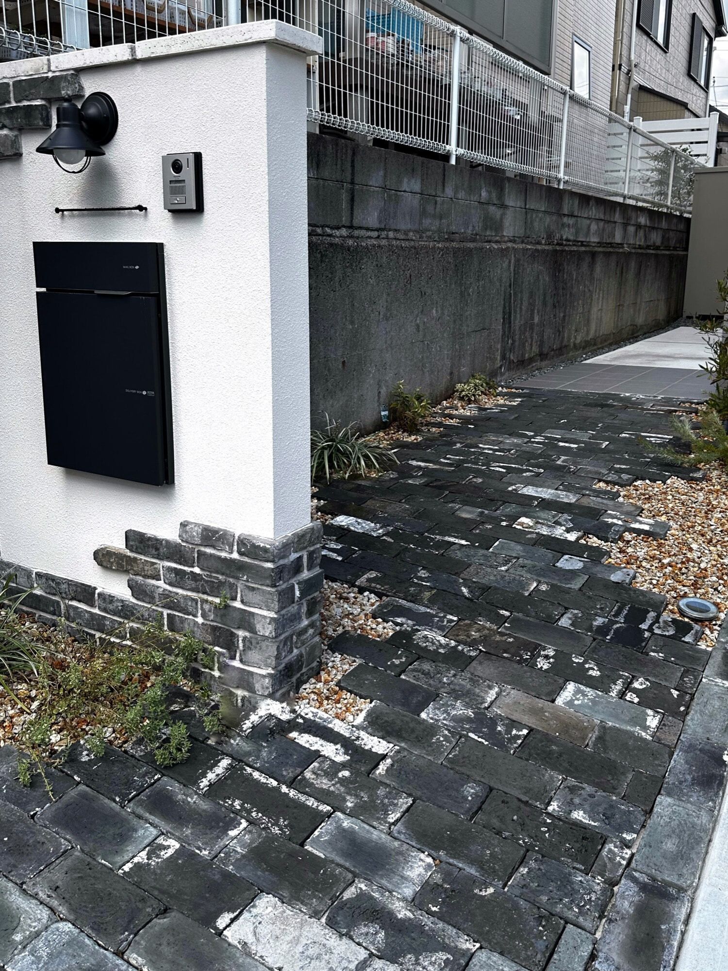 「門柱もしくはアプローチにグレーのレンガを取り入れたい」とリクエストをいただき、