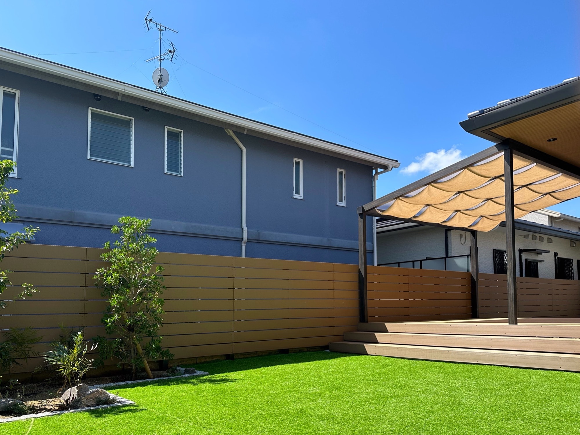人工芝とウッドデッキをメインに構成したお庭。