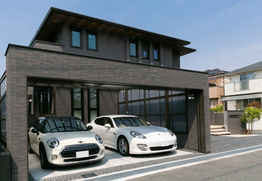ガレージや門柱をお家の外壁と同じタイルで仕上げることで一体感が生まれ、迫力のあるまとまり感と高級感演出されます。