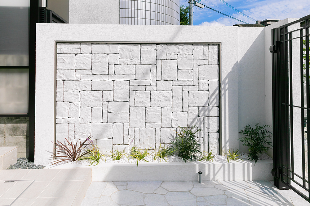 住まいの外壁の色と合わせながら、単調な外構にならないように素材をミックスさせて濃淡を出すことで高級感を演出。