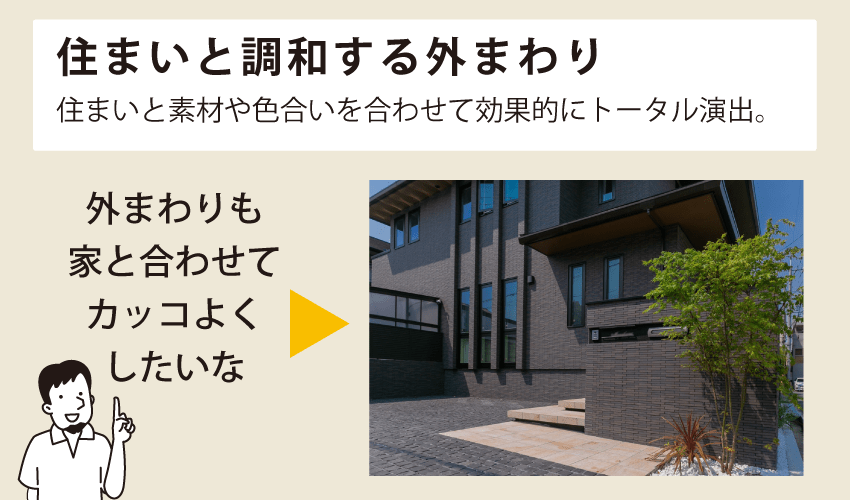 お家の顔とも言える外まわり(外構)。タイルなどの素材や色合いを合わせて住まいと調和させることでスタイリッシュで全体にまとまり感が生まれます。