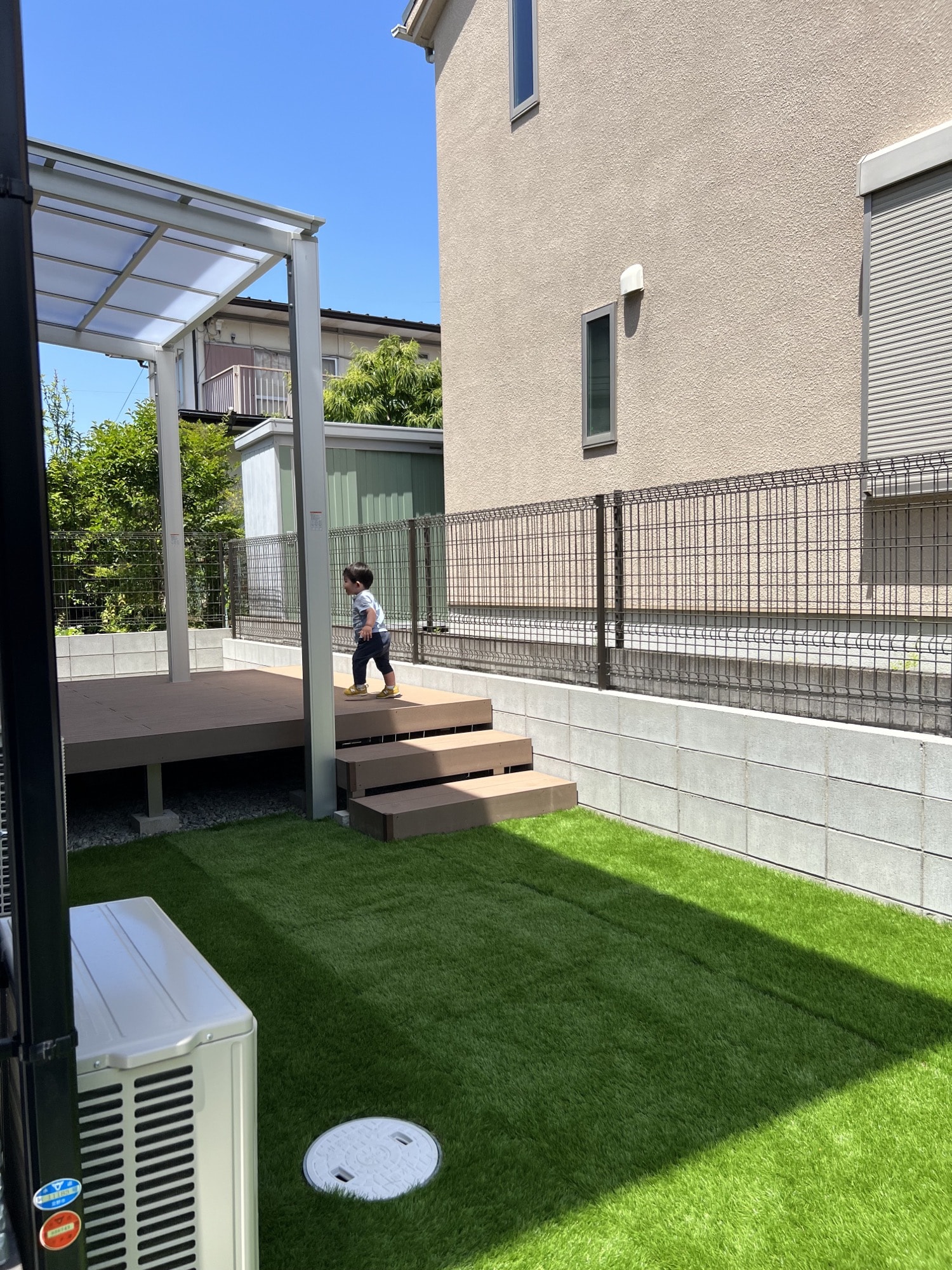 お庭はウッドデッキ&人工芝で、お子さまがのびのび遊べる空間に。