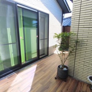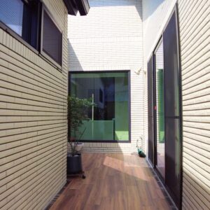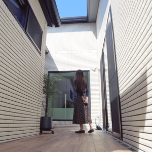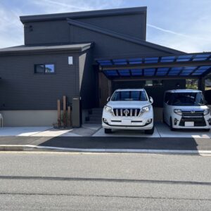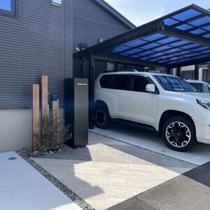 アプローチとして使用できるエリアが限られている中、車が乗っても問題ない厚みのタイルを使用し、斜めに貼ることでオシャレな印象に。