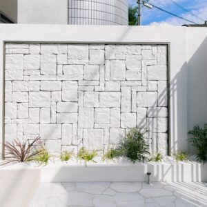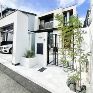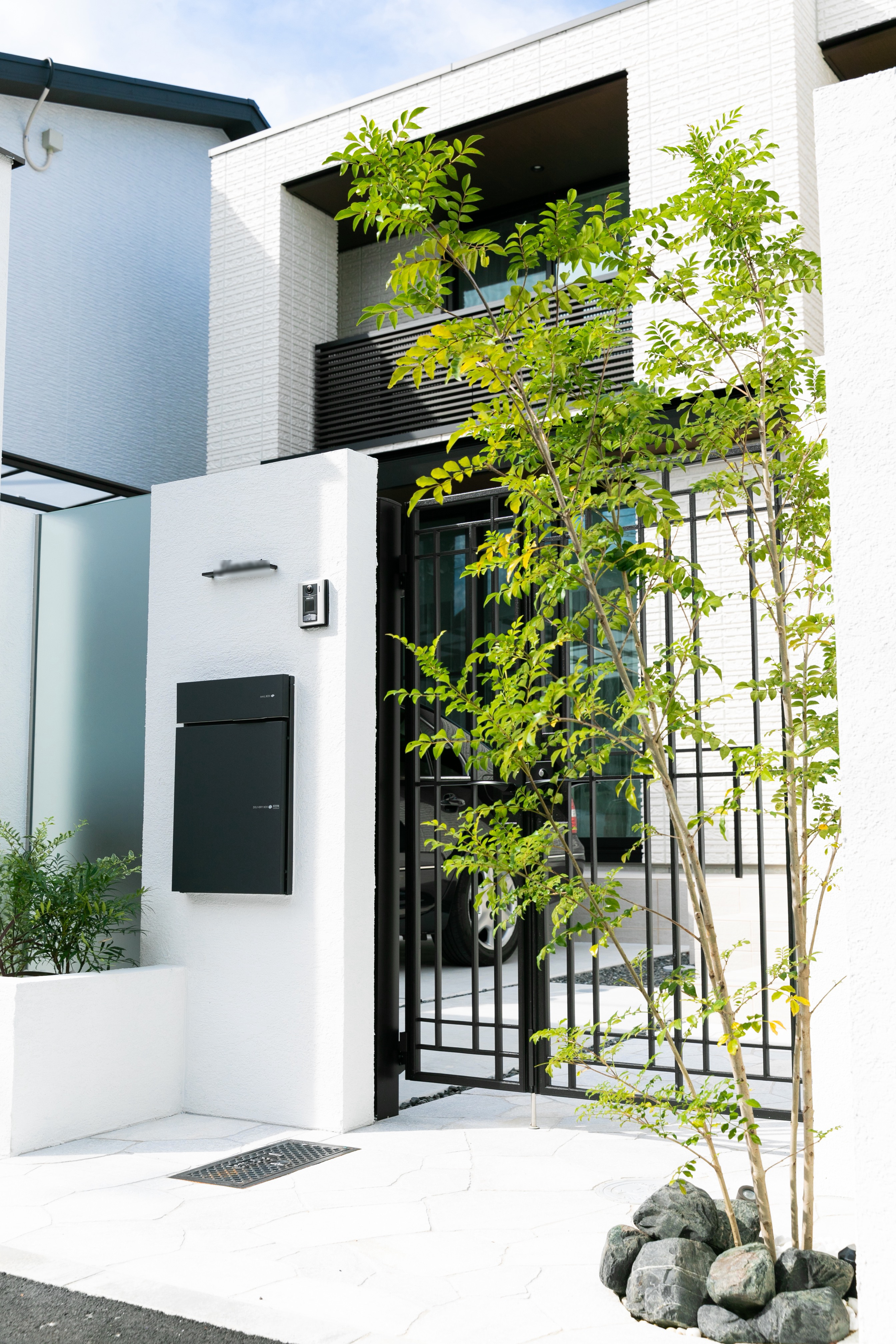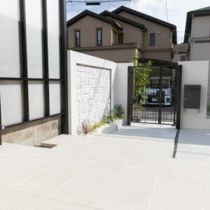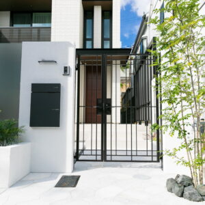 外壁に囲われているクローズ外構ですが、門柱一部に擦りガラスを取り入れることにより、開放感のある印象に。