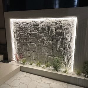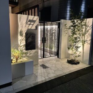 夜は門扉の間からもれるデザイン壁の光が幻想的です。