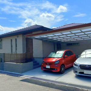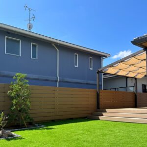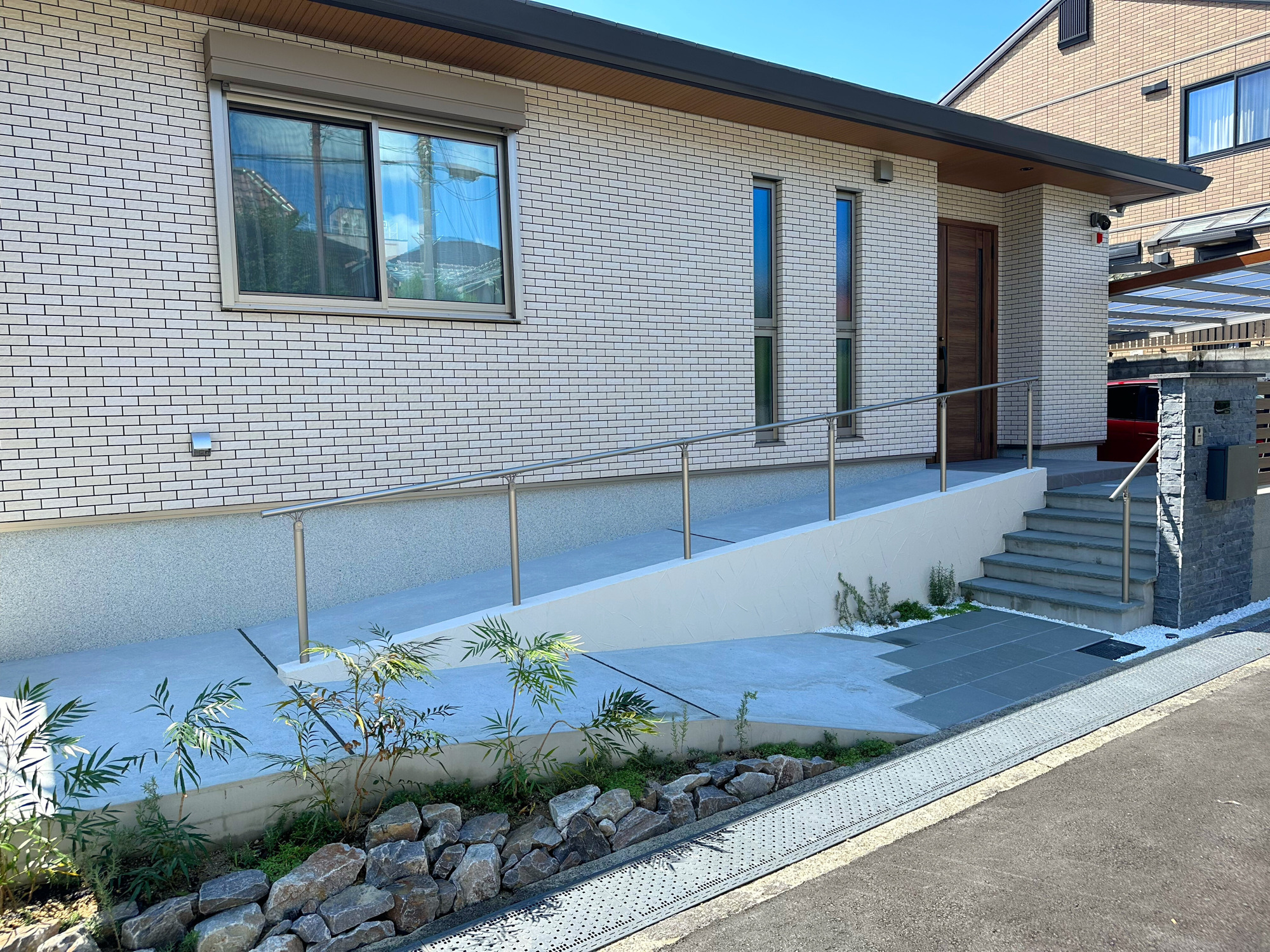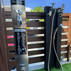 玄関前には、ワンちゃん用のカートが通れるスロープとワンちゃん用のシャワーを設置。玄関周りの植栽は、ワンちゃんにとって害のないものを選定しています。愛犬との生活を前提に、生活のしやすさと安全面を第一に考えて設計しました。