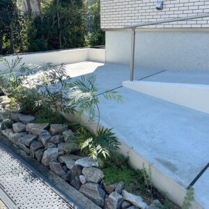 建物の雰囲気とあうよう、栗石と植栽をアクセントにした和モダンなエクステリア。