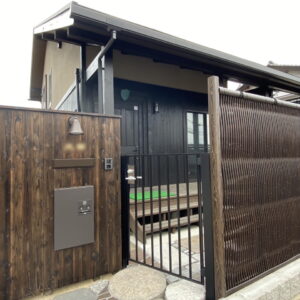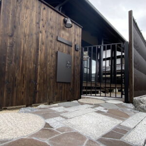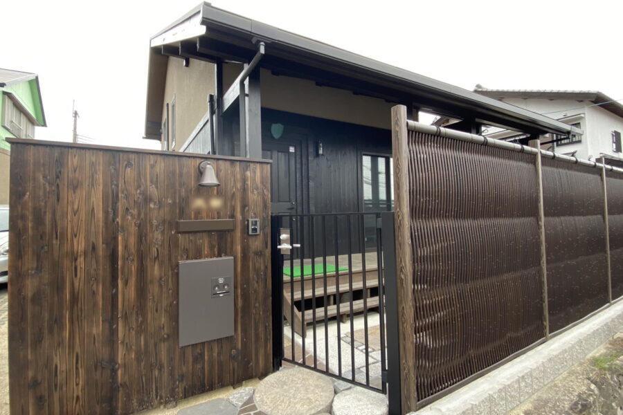 焼き杉板を使用した門柱、目隠しにタカショーの大津垣を使用し、和モダンなお住まいに合わせた外構に仕上げました。