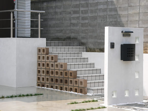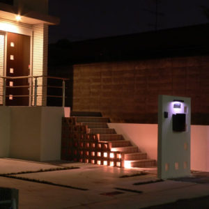 夜には 階段横のポールライトが、ウィンドゥクレイ(レンガ調)や門柱横のガラスブロックから灯りがもれ、間接照明のようにやさしく灯ります。