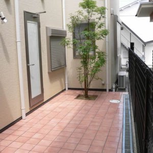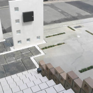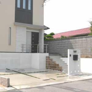 白いモダンな建物にあわせ、センプラル(手塗り材)を使用した門柱、グレーのブロンテペイバー(舗装材)でアプローチを引き立てました。