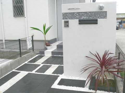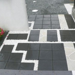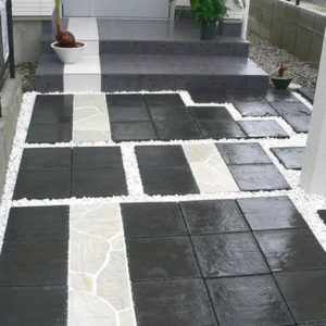 アプローチ部分に黒い平板、テニソンペイバーを配置した隙間に、天然石ホワイトクォーツを使い、モダンでスタイリッシュな空間を生み出しました。