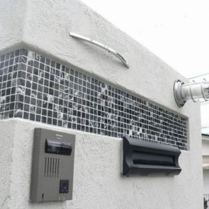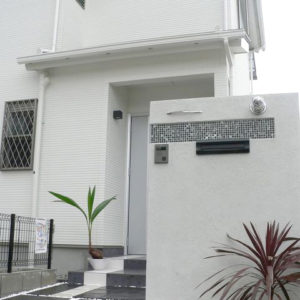スペイン産の漆喰、センプラルとモノトーンのモザイクタイルを用いてシンプル個性的な門柱に仕上げました。