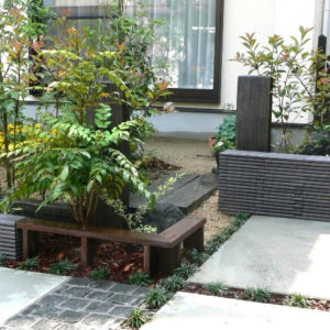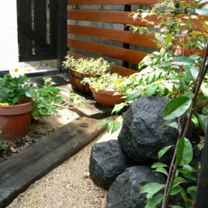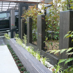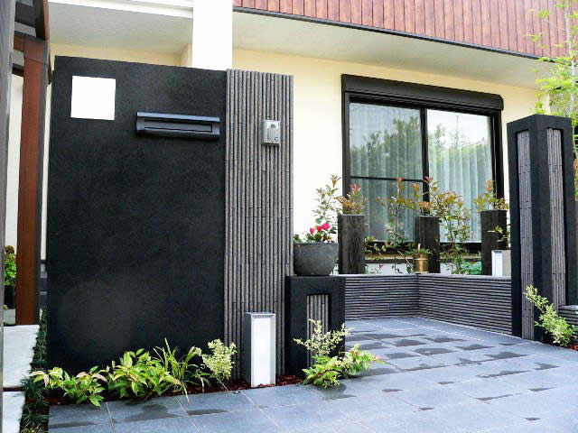 黒の濃淡を基調としたK様邸は、石材と木材などの異なる素材で 同系色の中にも変化をつけ、落ち着いた趣が感じられます。