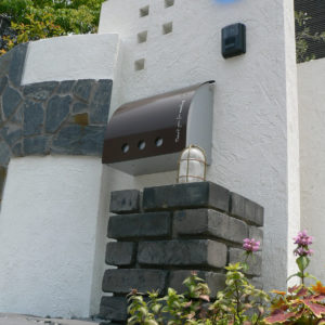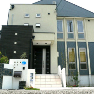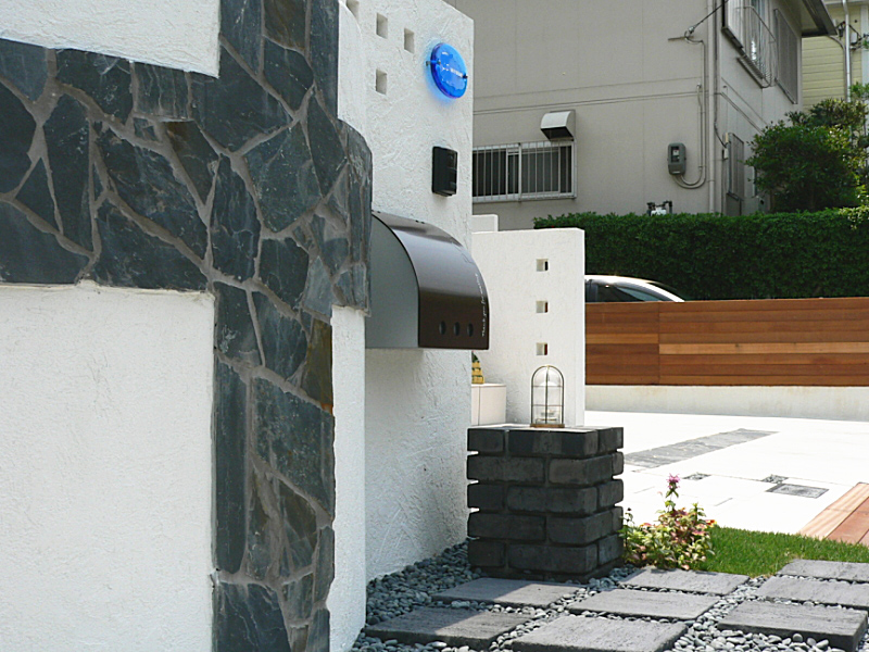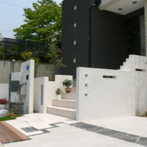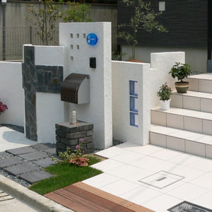 アプローチより玄関への階段と駐車スペースとの間に設けた壁面や門柱も、 一列ではなく重ねることや、所々に空間を設けることにより、立体感を創り上げました。