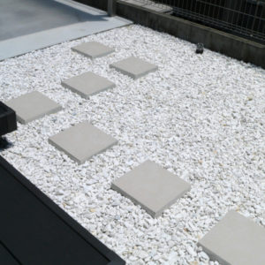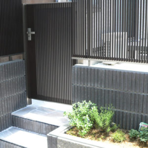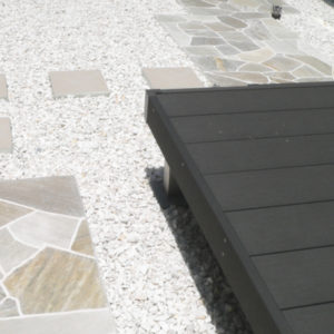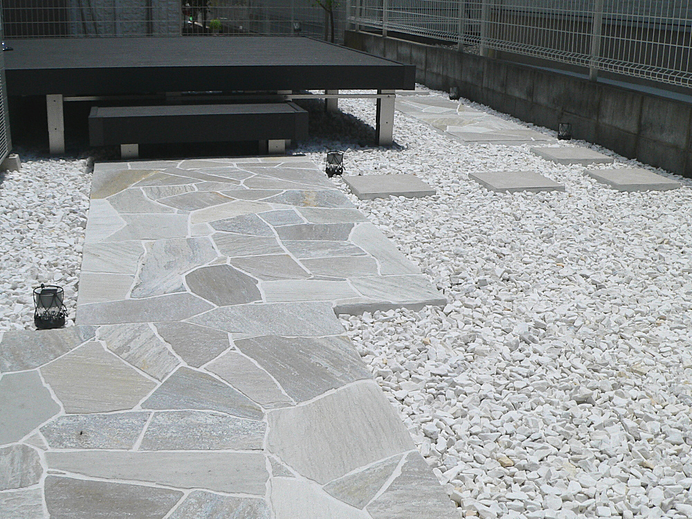 門から続くアプローチを、自然乱形石貼りで奥行き感を出しました。 さらに、歩きやすい歩幅でそのウッドデッキ周りを囲みました。 和を感じさせる上品なお庭に仕上がりました。