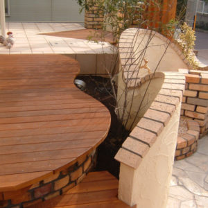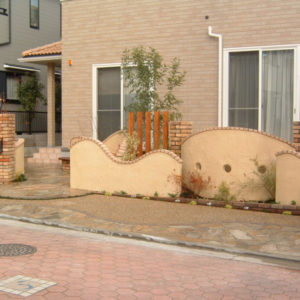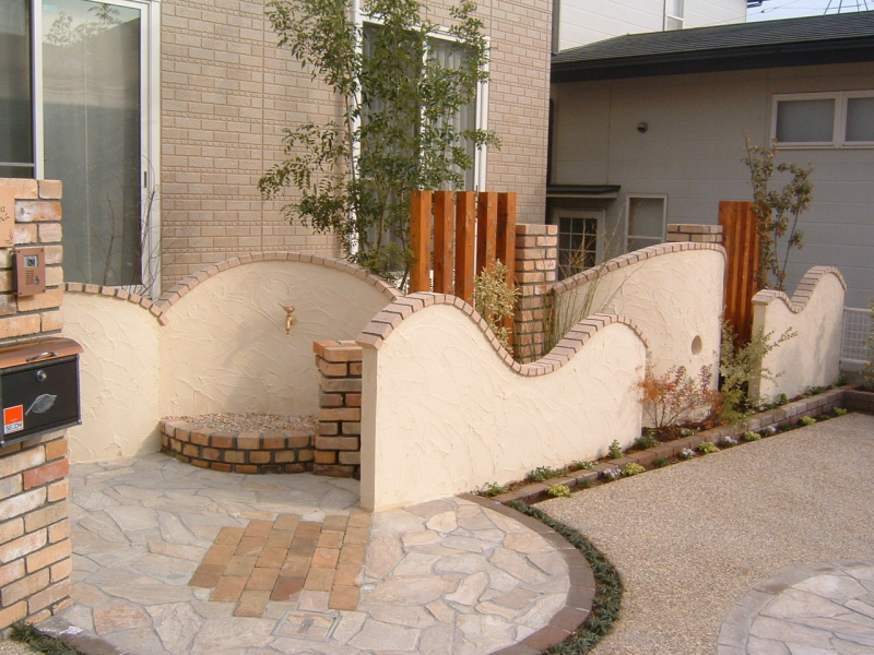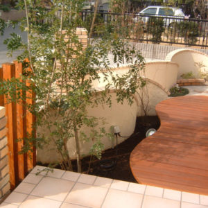 テラスはウリン材とテラコッタタイルを組み合わせ、塀はRをつけたデザインで、あらゆる角度から楽しめます。