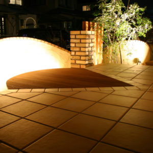 夜の照明は、植栽やレンガ、木材等の素材が一層引き立ちます。
