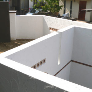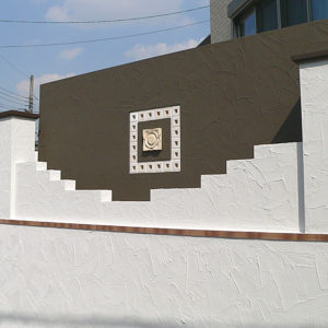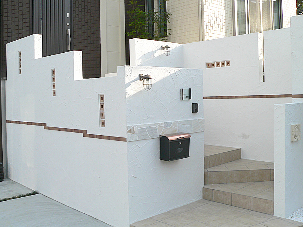 南国の植物をモチーフにした石の彫刻「ストーンレリーフ」やマリンランプ、自然乱形石等を使用し、アジアンリゾート風に施工。 白を基調にシンプルで優しいイメージにさせていただきました。