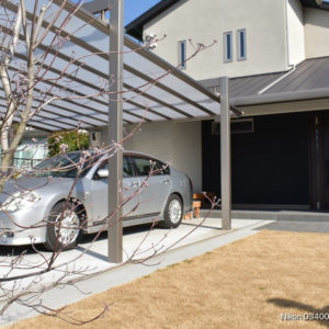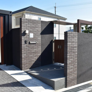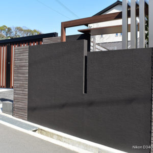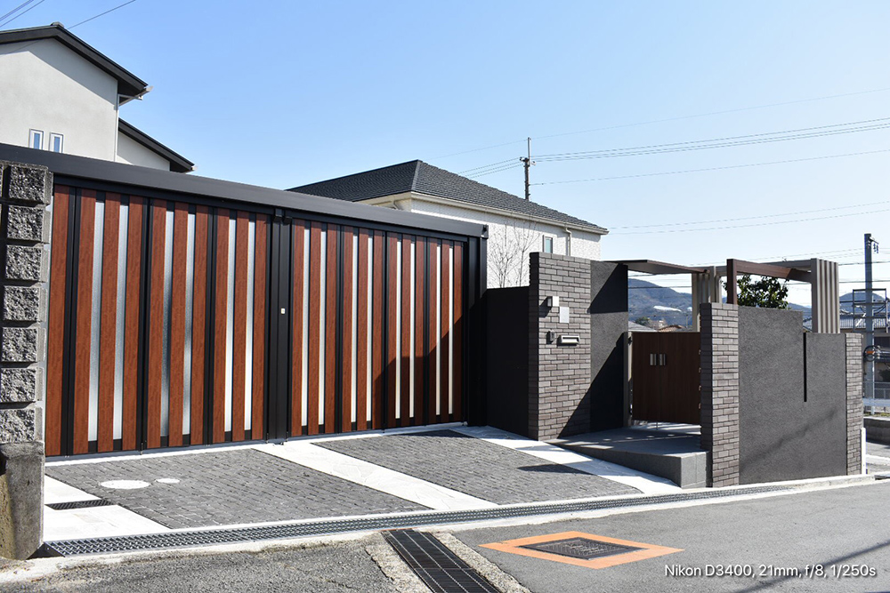 ガレージ前にプレミエスゲートを使用し、壁は黒ベース、プラスGを使用して門周りを大きく見せ、カーポートはアーキフィールドを使用しました。