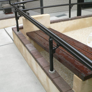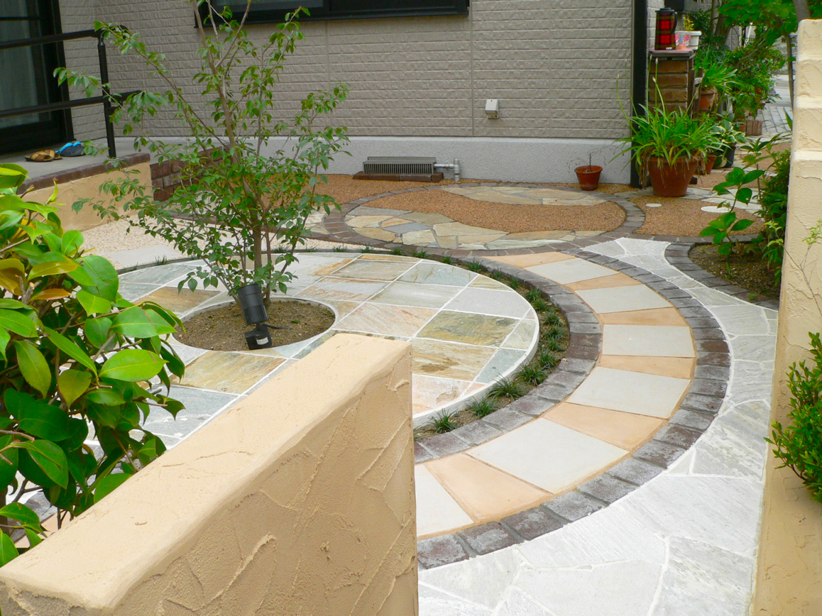 緩やかなスロープ、手すりを設け、ご高齢の方にも安全、安心して過ごして頂けるようなお庭をイメージしました。