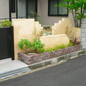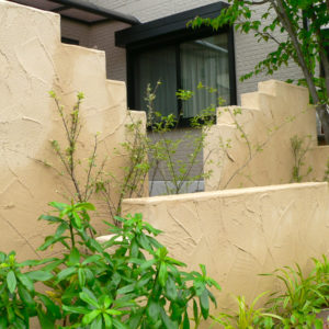 既存のお庭に自然と馴染む手塗り仕上げの壁、お庭でホッと一息くつろげる、木製のベンチを設置しました。