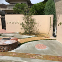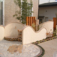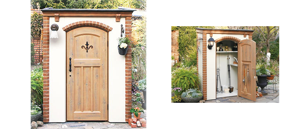 お庭を華やかに飾るおしゃれで可愛いレンガのアーチと屋根瓦のデザインが印象的な可愛い物置